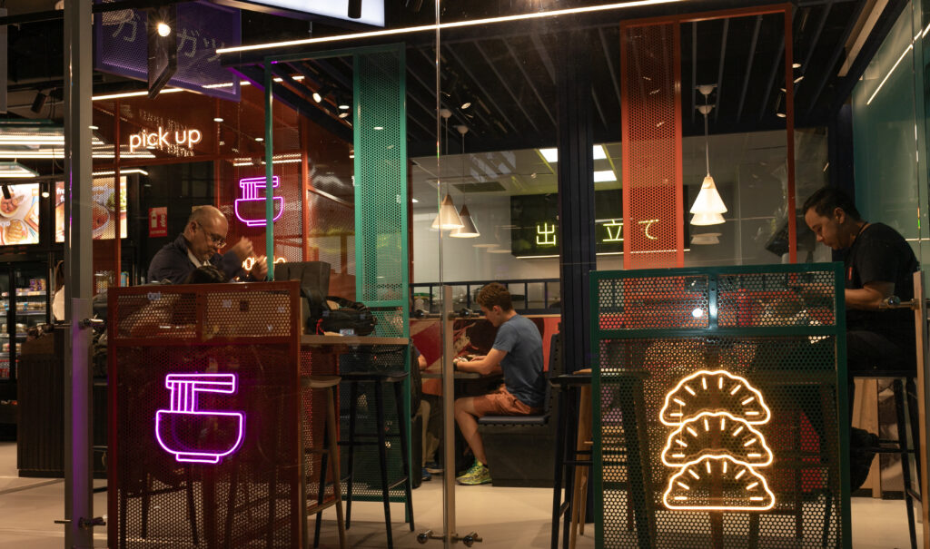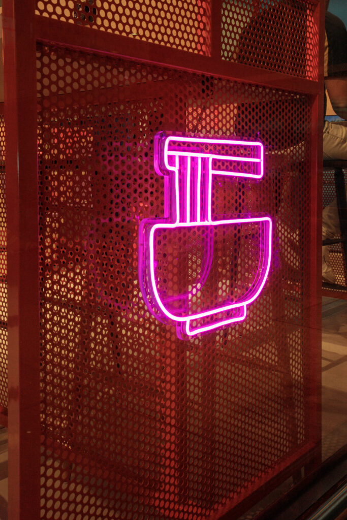 El diseño del local apuesta por luces cálidas, neones estratégicamente ubicados y un ambiente desenfadado, que rompe con la frialdad típica de los espacios aeroportuarios. La iluminación juega un papel protagonista, creando contrastes y zonas de confort visual que invitan a quedarse un poco más. El uso de materiales contemporáneos, texturas urbanas y mobiliario modular permite una distribución flexible, perfecta para todo tipo de viajeros, desde el que va con prisa hasta el que busca relajarse.